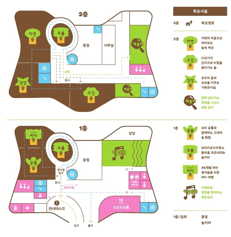 - 1층에는 공룡숲, 오름숲, 바다숲(영아놀이터)가 위치하고 물품보관함, 가족휴게실, 의무실 등이 자리하고 있습니다.
