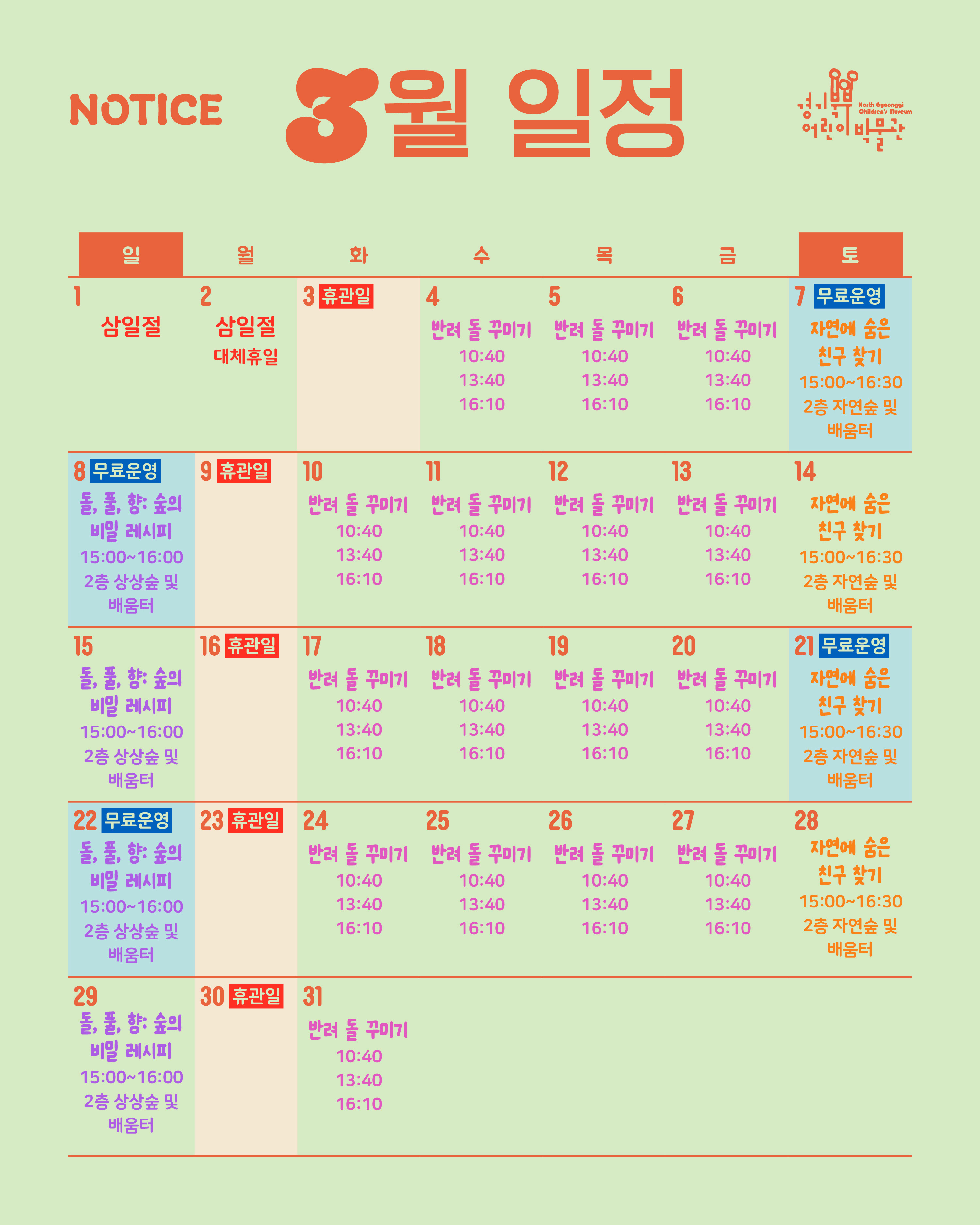 3월 일정 (3/1, 3/2 공휴일 운영 안내)