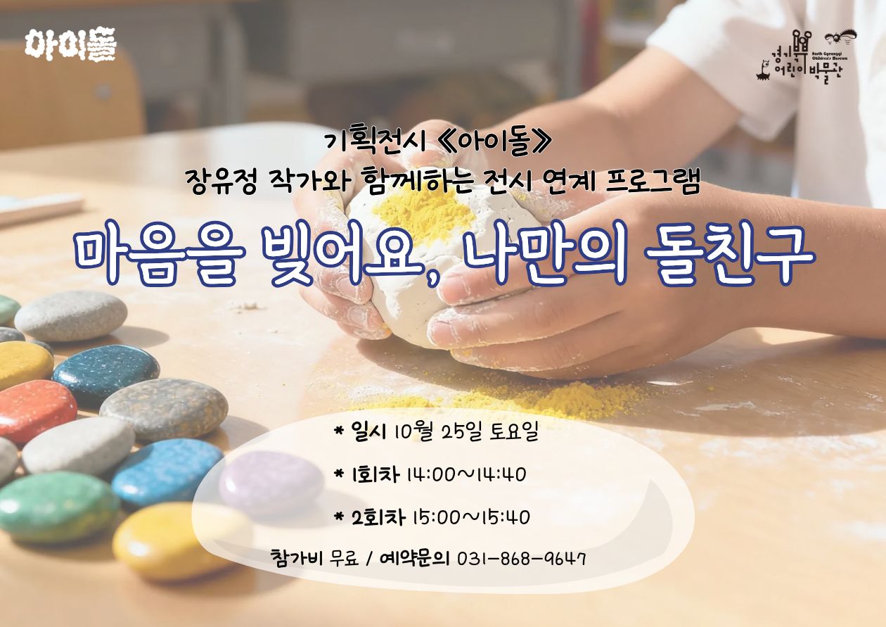 10/25(토) 14, 15시 장유정 작가님의 따뜻한 지도로 진행됩니다.자연이 빚은 돌, 인간이 빚은 도자기가 만들어지는 과정을 따라 나만의 돌친구를 직접 빚어보아요!